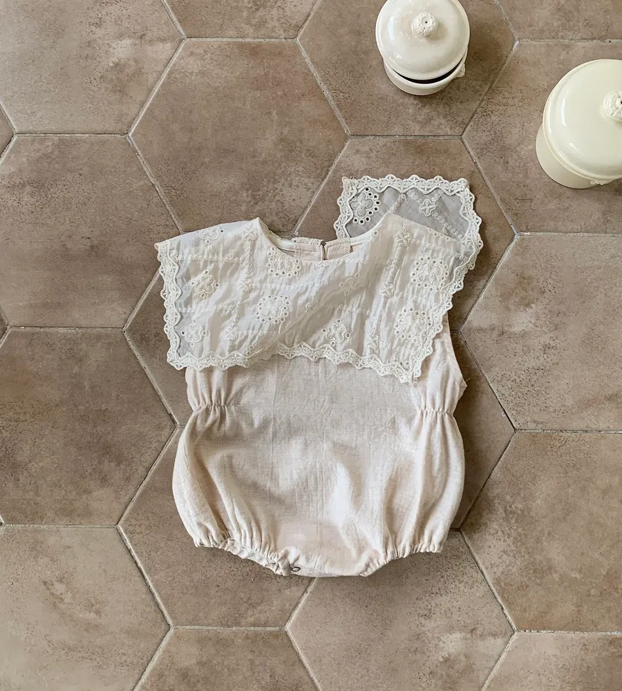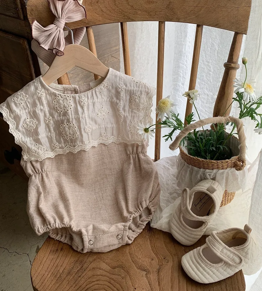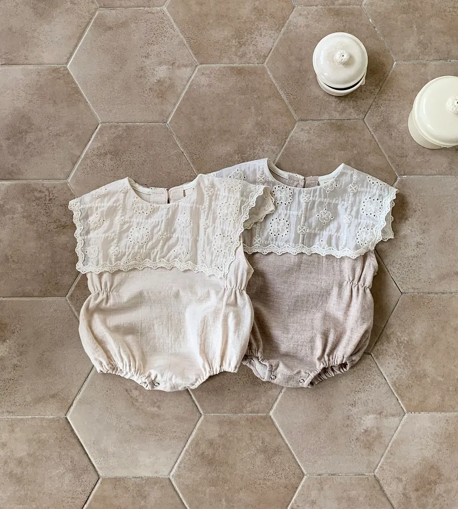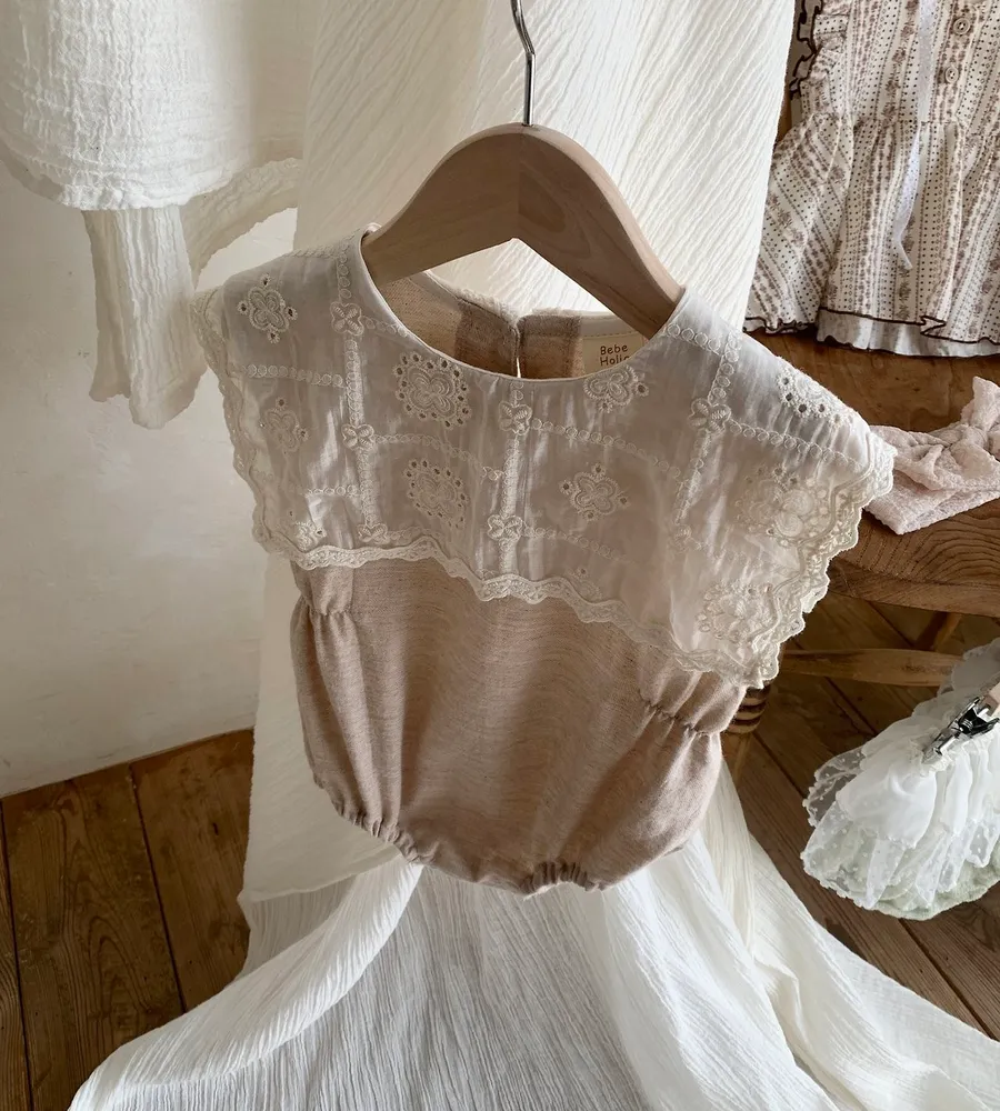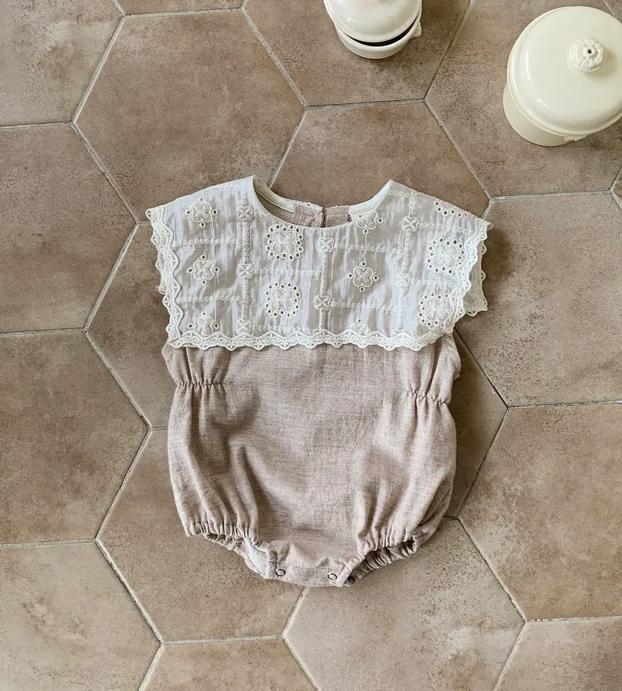 26'夏〡Bebeholic〡緹花拼接棉麻感包屁衣